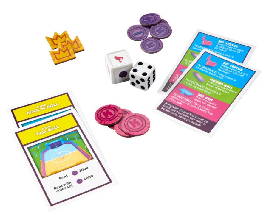 In this exciting edition of the Monopoly game, players buy up as many Rounds as they can. The more Rounds they own, the more Kudos they can collect. Players move around the board as a Fall Guys character token, performing wild actions such as jumping, grabbing, and falling to victory! Besides dodging the 3D obstacles, players collect valuable Crowns when passing Go, and roll the Knockout die to change gameplay.