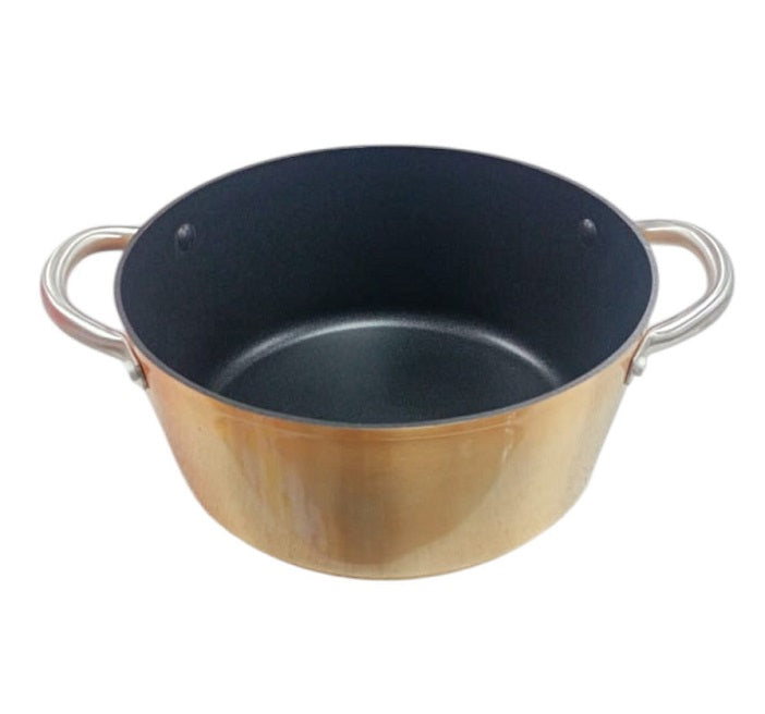 The pan’s exterior has a copper-colored finish, while the interior is coated with a black non-stick surface for easy cooking and cleaning.